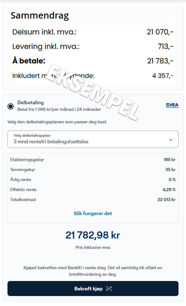 Før du inngår en avtale, får du tydelig informasjon om renter, gebyrer og totale kostnader. Eksempel på beregning vises i checkout etter at du har lagt varer i handlekurven. På den måten kan du ta et informert valg basert på dine behov og forutsetninger.