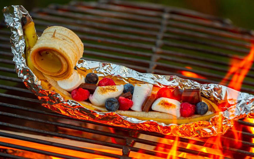 Grillet banan med marshmallow, sjokolade og bær
