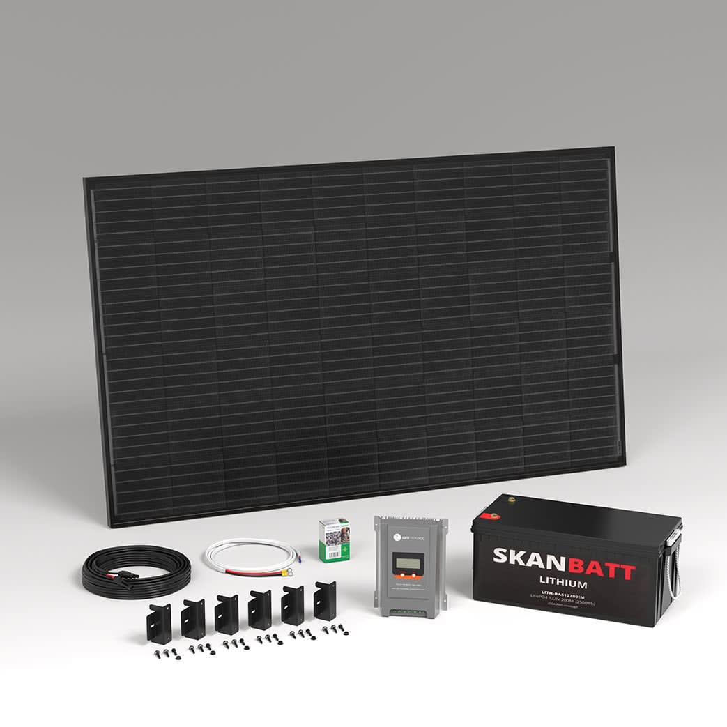Selve solcellepanelet består av et 335W PERC panel med teknologi som har en høyere virkningsgrad enn de tradisjonelle panelene. Dette er en stor fordel i det norske klimaet. Det er dessuten ikke nødvendig å vinkle dette panelet, noe som gjør at det tar seg bedre ut på hytteveggen. Våre antireflekterende paneler er tillatt i sårbare naturområder. Batteriet i solcellepakken er av typen SKANBATT Lithium Batteri 12V 200AH 200A BMS (2560Wt). Batteriet leveres uten bluetooth. Vi anbefaler derfor å bruke en Victron SmartShunt dersom du ønsker overvåkning av batteriets tilstand på mobiltelefonen (se tilbehørsprodukter for anbefalt variant). NB! Du kan utvide pakken med så mange 200A lithium batterier du ønsker. Solcelleregulatoren, en 30A MPPT regulator, er også av høy kvalitet og håndterer alle typer batterier.