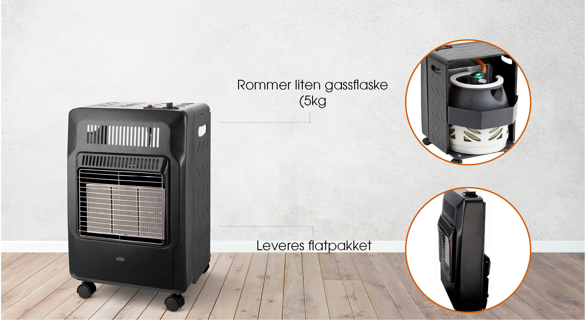 VERA Gassovn 4,2kW kompakt er kun 58cm høy. Varm opp rommet raskt og effektivt med denne plasseringsvennlige gassovnen som kan gi inntil 4200W effekt! Perfekt for rask oppvarming av hytta, garasjen eller hjemme. Bruker du gassovn som tilleggsvarme så kan dette være lønnsomt, fordi du kan tillate en lavere temperatur i perioder du ikke benytter boligen/hytta.