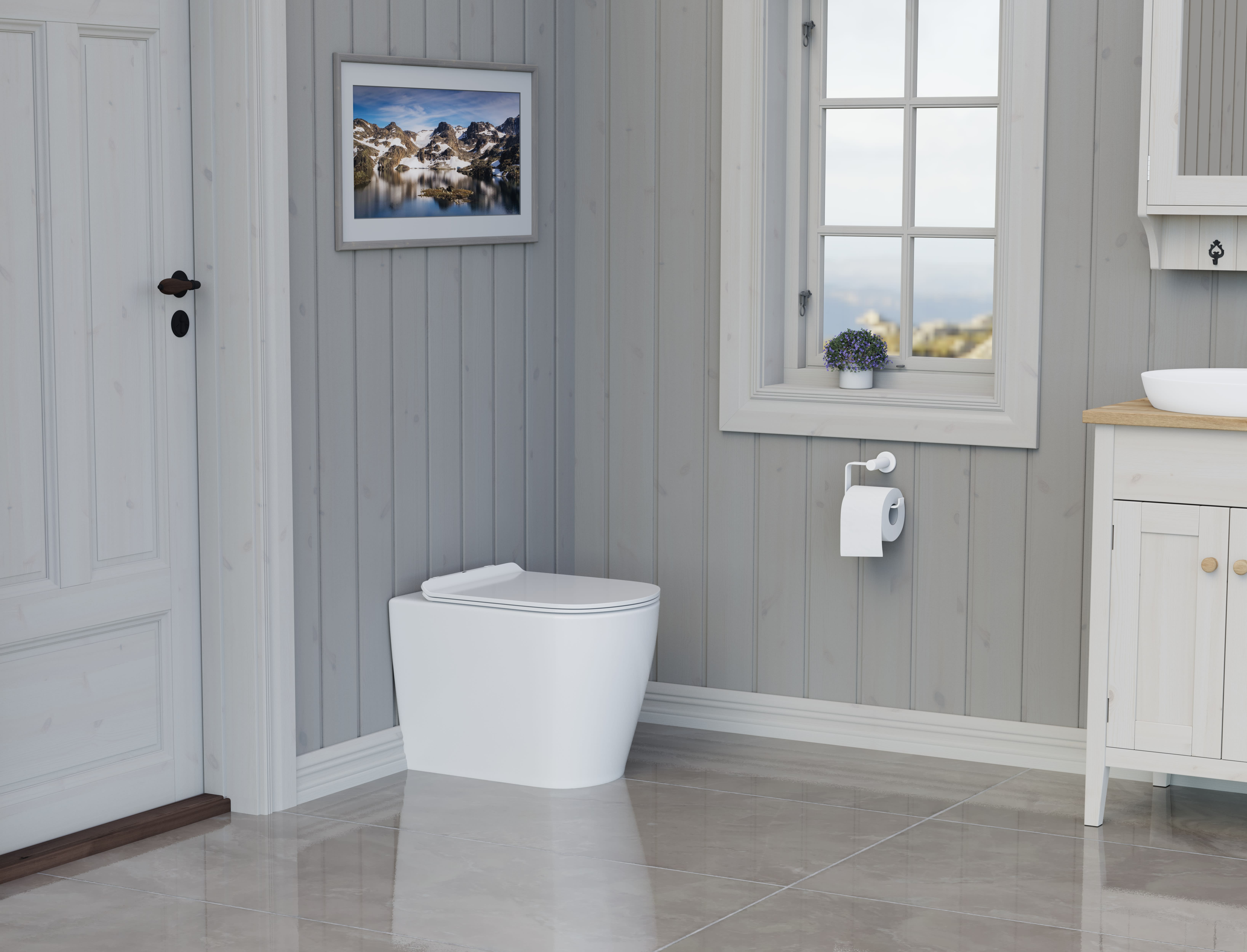 Vera toalettstol har et modern preg, toalettet er konstruert slik at det kan settes helt inntil veggen. Nedføringsrør og urinslange føres gjennom gulv.